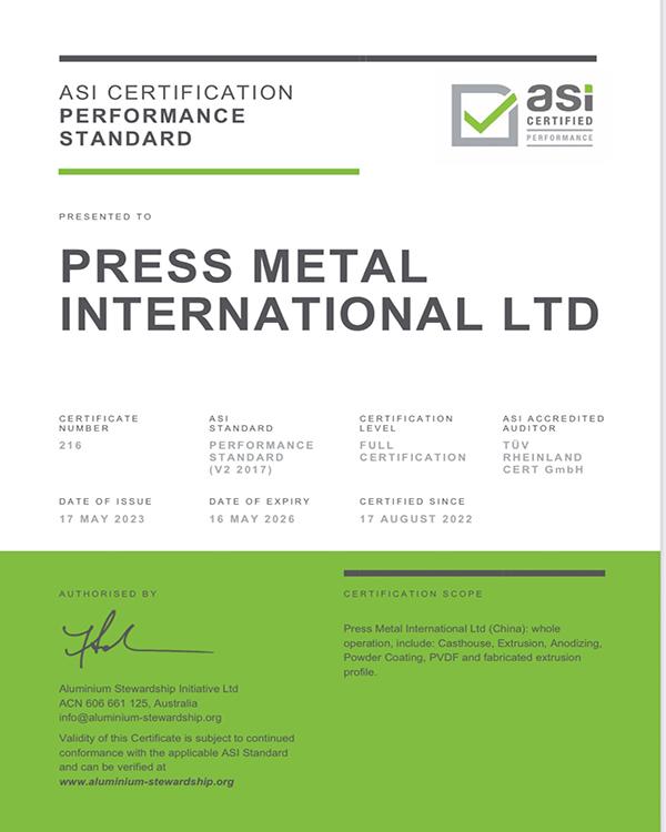 鋁業(yè)管理倡議ASI績效標(biāo)準(zhǔn)認(rèn)證